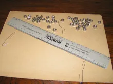 It is important that the beam can be trusted to be a consistent weight-per-inch (or centimetre) all along its length. In other words, that it is the same thickness and density all the way along. A piece of wood from your scrap pile would probably not be suitable. But an ordinary plastic school ruler will do just fine. Not only that, but it is already marked out for you. What you need to do is accurately drill three holes in it. My ruler had inch marks on one edge and metric marks on the other, so this description uses mixed units, as follows;