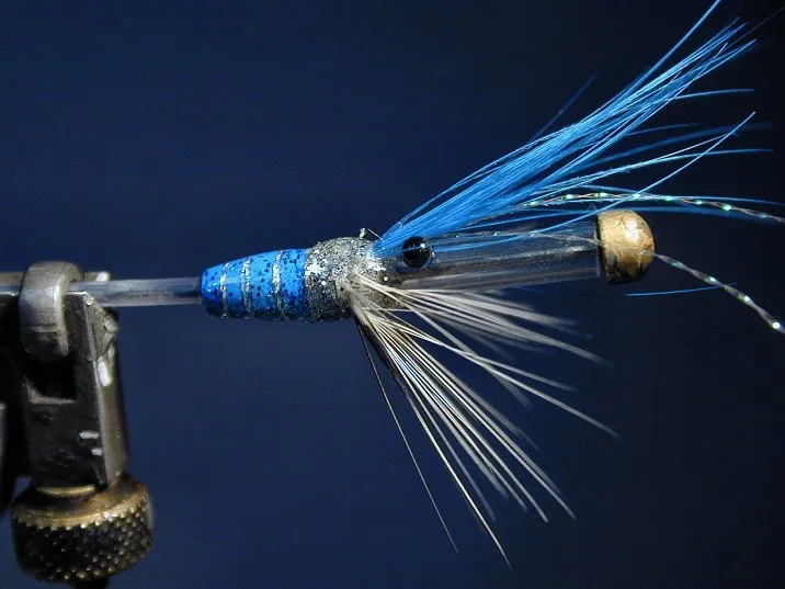 The front of the fly is completed with the feelers, eyes and forward hackle.